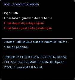 Sebuah item yang dibuat oleh Tim Atlantica Rebirth Indonesia untuk mengapresiasi Para Atlantian yang bermain di Atlantica INFERNO. Kamu bisa mendapatkan sebuat TITLE SPECIAL hanya dengan bermain di Server Inferno di Bulan Pertama.